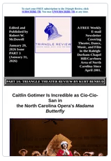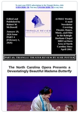 Part 4 includes Susie Potter’s review of the North Carolina Opera’s January 30th and February 1st production of Madama Butterfly.
