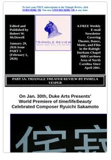 Part 5 includes Pamela Vesper’s review of Duke Arts Presents’ January 30th world-premiere presentation of time/life/beauty: a celebration of Ryuichi Sakamoto.